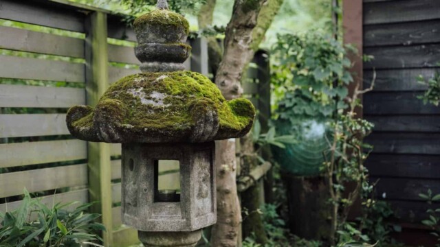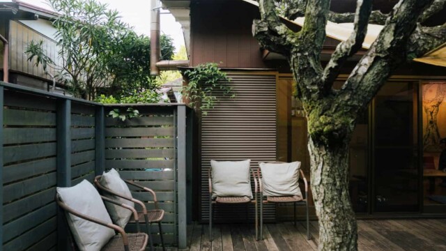 風がそよ吹くウッドデッキの先に目をやると、かつての住人が愛でていたという椿や梅の古木、苔むす石灯篭がある庭が、静かに迎え入れてくれました。